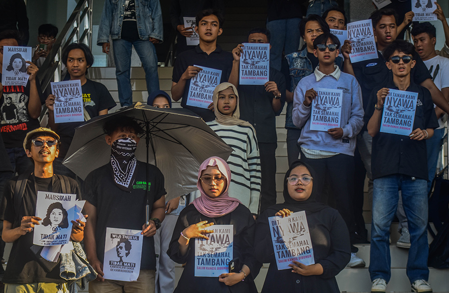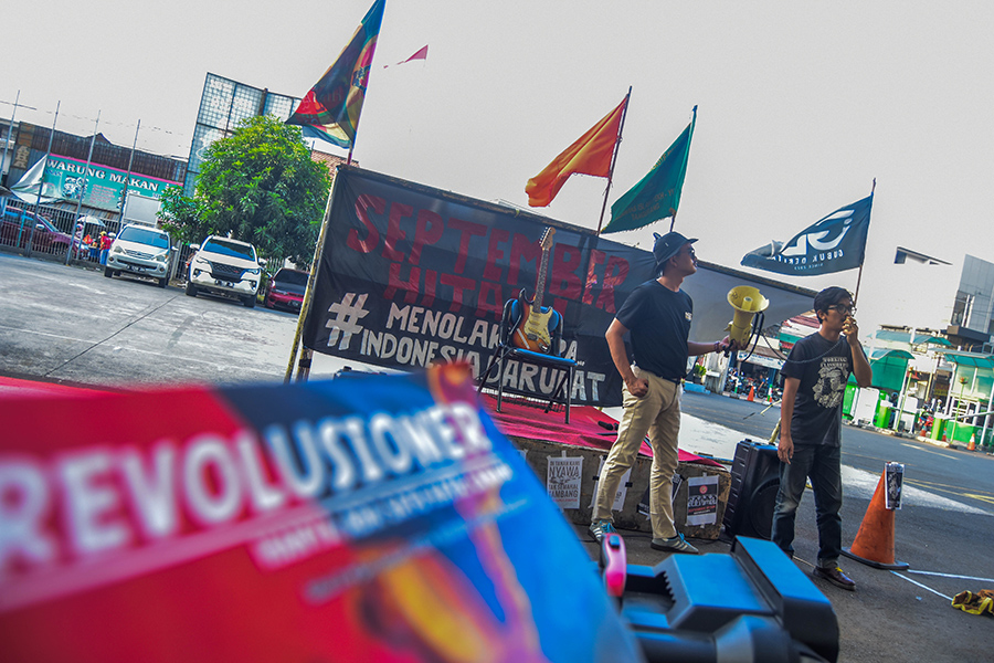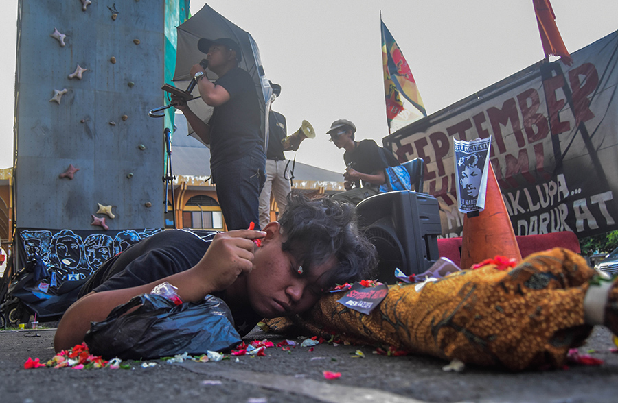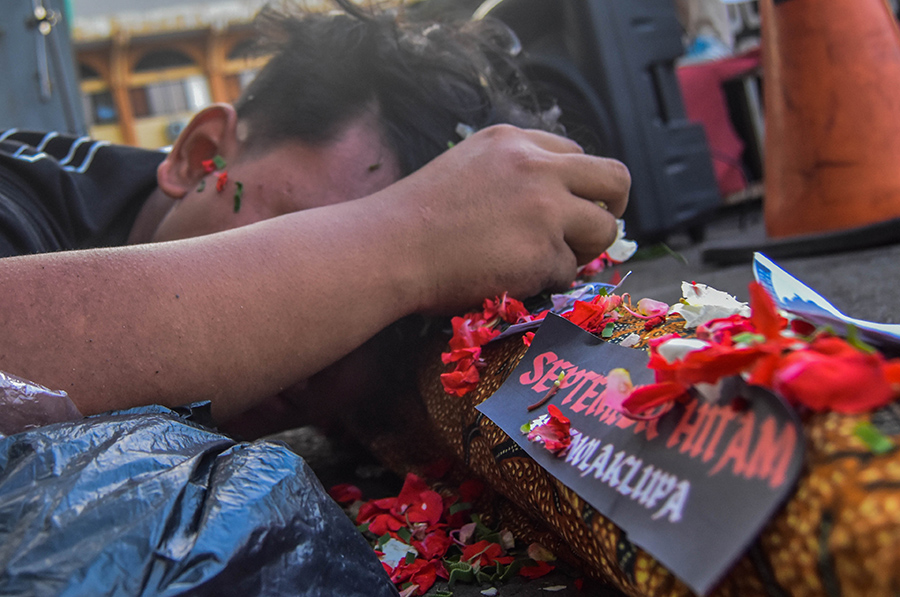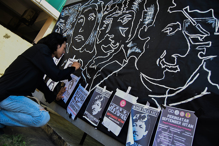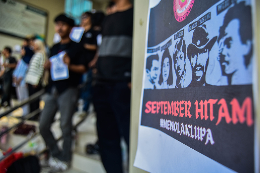 Sejumlah mahasiswa Universitas Islam Syekh Yusuf (Unis) menggelar aksi teater perjuangan menolak lupa September Hitam di pelataran Kampus Kota Tangerang, Banten, Kamis (05/09/2024). Ornamen Mahasiswa Unis membuat acara menolak lupa para pejuang aktivis yang hilang di culik dan di bunuh dengan menyampaikan orasi, puisi, teater, lapak baca, musik gugur bunga, dan bedah film istirahat kata-kata milik wiji tukul. Foto : Ilham Herda Fauzi/BERITALAGI