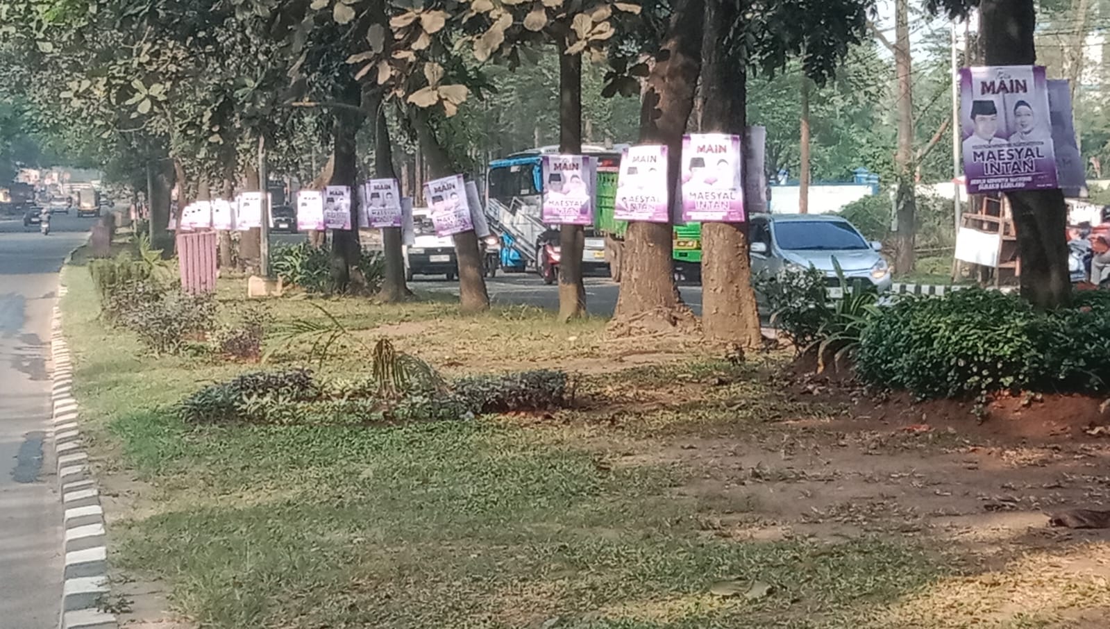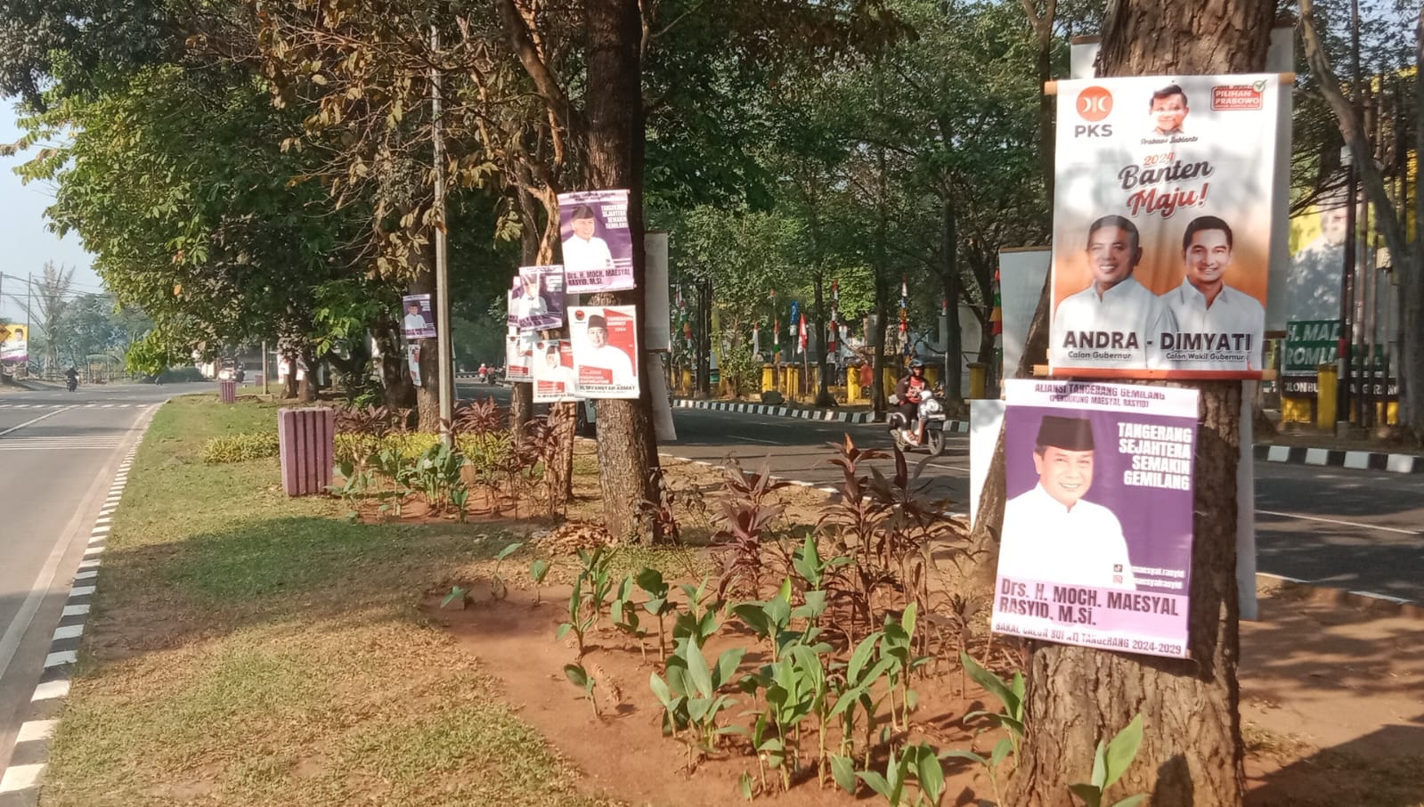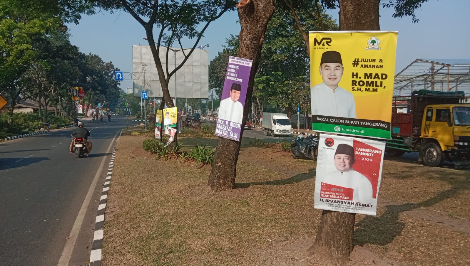 Penampakan sejumlah alat peraga kampanye (APK) bakal calon bupati Tangerang di Jalan Pemda Tigaraksa, Kabupaten Tangerang.  APK dipasang di pohon tersebut melanggar Pasal 70 Ayat 1 PKPU Nomor 15 Tahun 2023 dan merusak alam. Foto : Mans/BERITALAGI